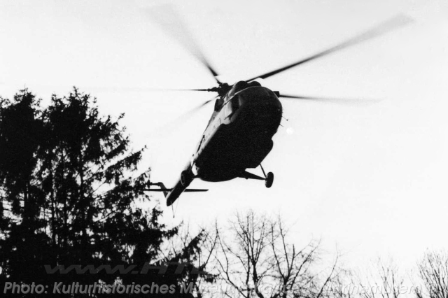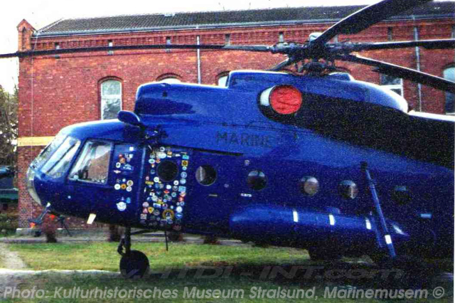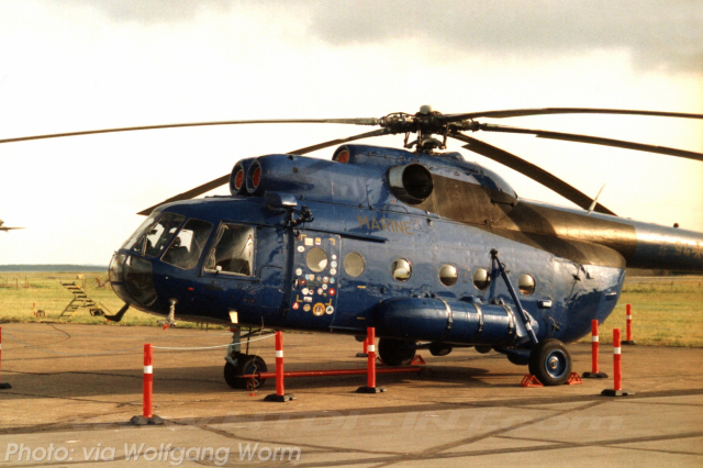 This helicopter was registered to East Germany as NVA-831 on March 25, 1977, and operated by the MHG-18 Kurt Barthel from June 21, 1977. It had to make a precautionary landing due to heavy vibrations at 12.07hrs on the December 2, 1982 at Doelitz near Gnoin (Kreis Teterow). Back in service till March 1991.
