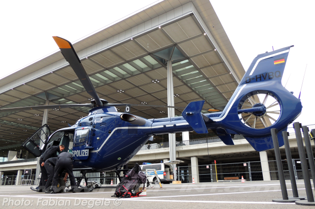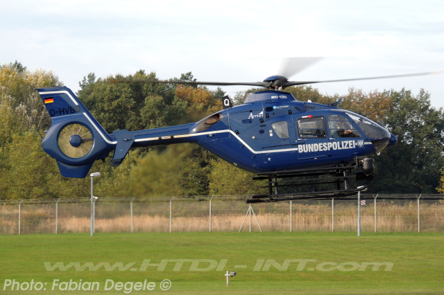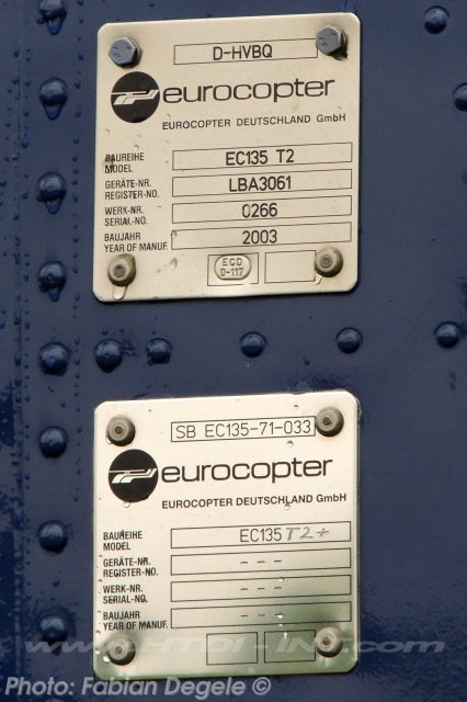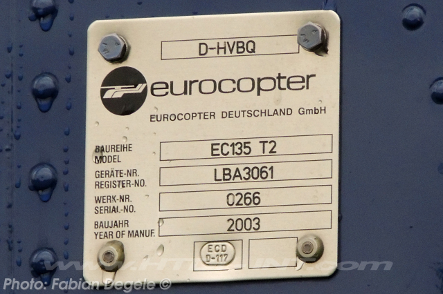 This helicopter is regd. in Germany by the Bundesminister des Innern as D-HVBQ with Mode-S Hex: 3E0A3E since 13.03.2003. CofA reduced to permit on 20.01.2009 after mod to the EC135T2+ version.